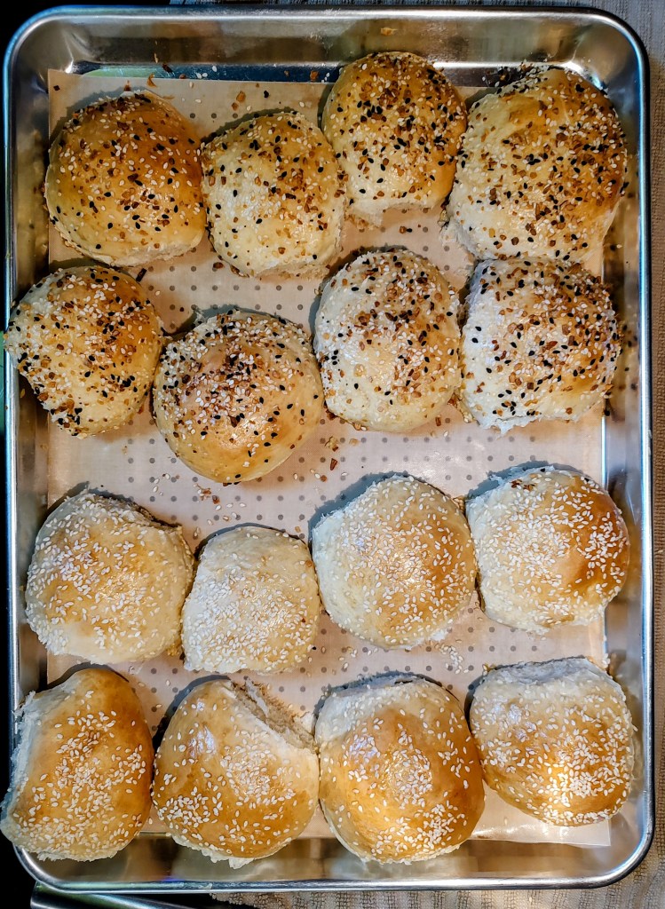 Freshly baked Hamburger rolls topped with sesame seeds and everything bagel seasoning.