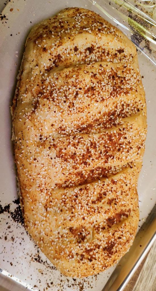 Freshly baked Italian bread topped with everything bagel seasoning.